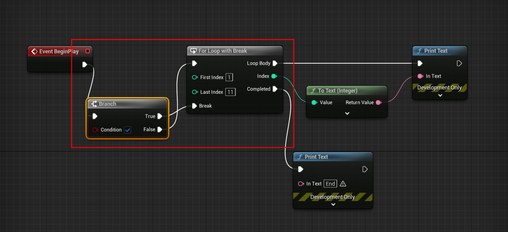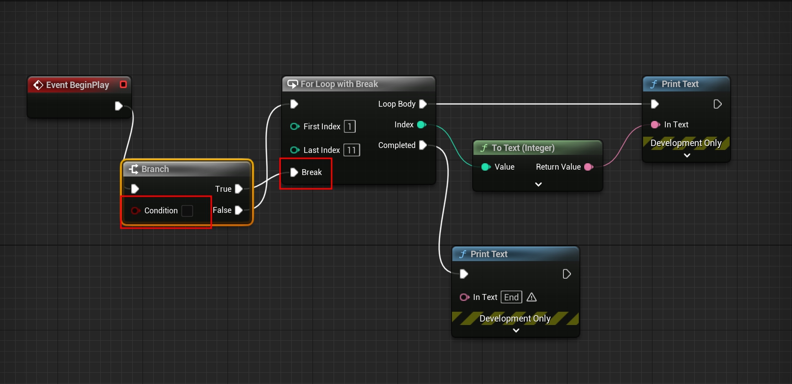 Branch를 생성해서 True이면 Break코드를 연결하여 Break를 진행하고 False이면 바로 For Loop with Break 함수가 작동되는 코드를 완성합니다.