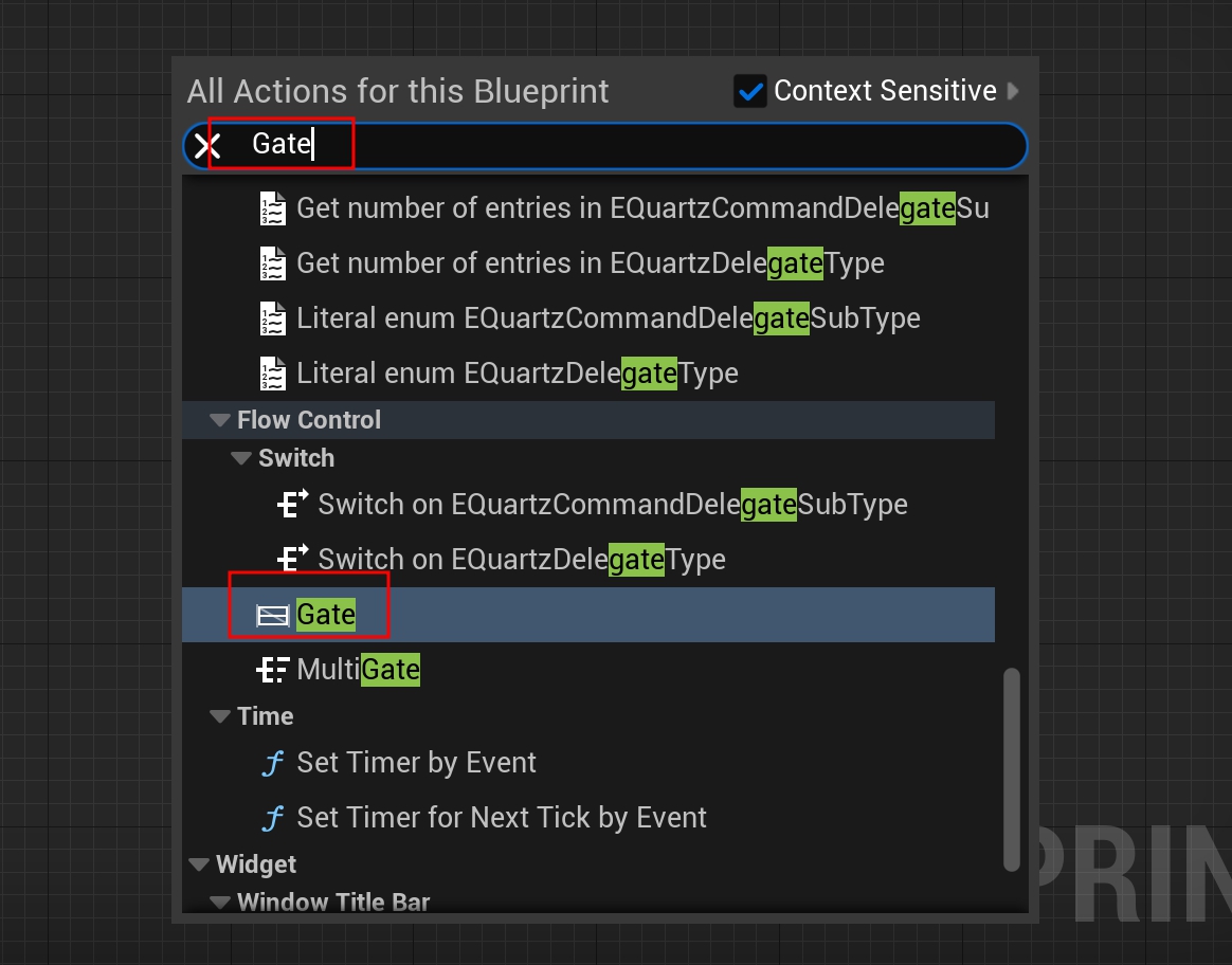 ▣ 먼저 블루프린트 바탕에서 오른쪽마우스를 클릭하고 Gate라고 검색을 합니다.