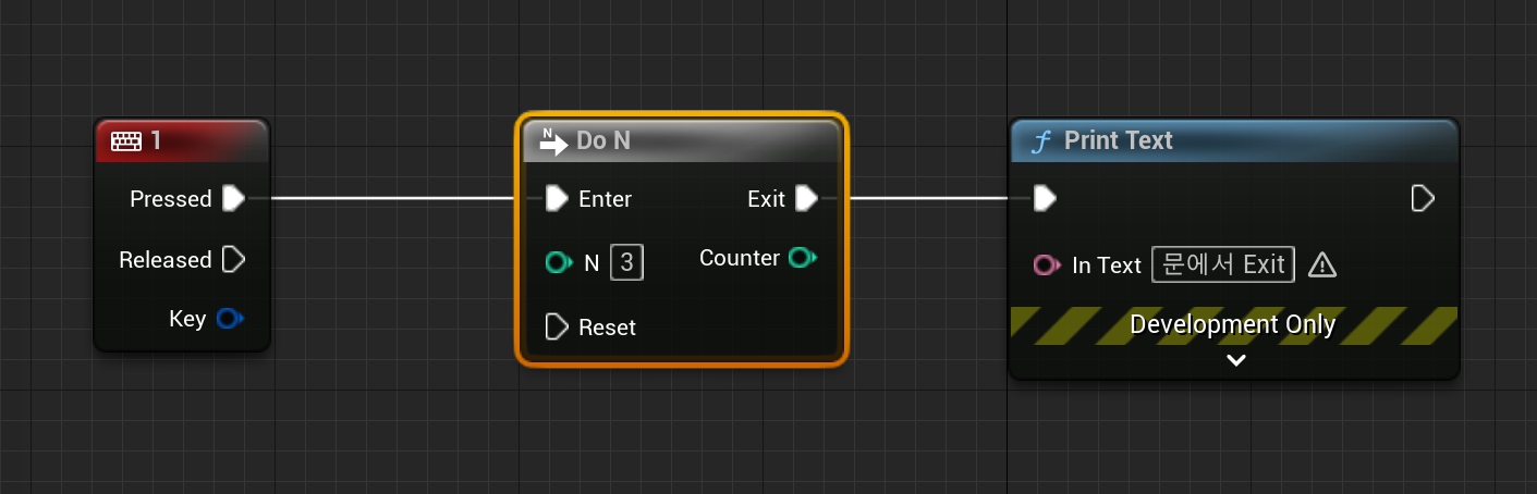 ▣ Do N에서 N에 값을 3이라고 지정을 하고 컴파일 저장을 한 후에 씬에서 플레이를 하고 1번 키를 계속 누르면 3번만