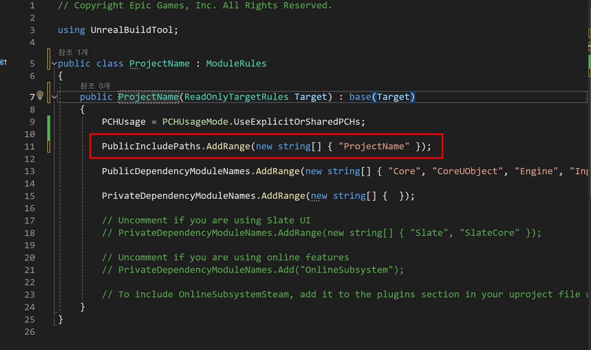 ▣ PublicIncludePaths.AddRange() : 코드를 사용해야 하는 경우는 특정 모듈의 헤더 파일들을 다른 모듈들에서도 사용 가능하게 할 때입니다. 이를 통해 모듈 간의 의존성을 관리하고, 재사용성을 높일 수 있습니다. 특히, 공용(퍼블릭) 헤더 파일을 포함하는 경우에 적합합니다.